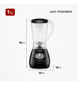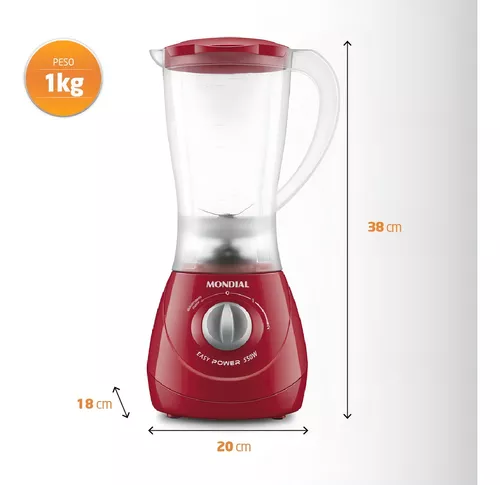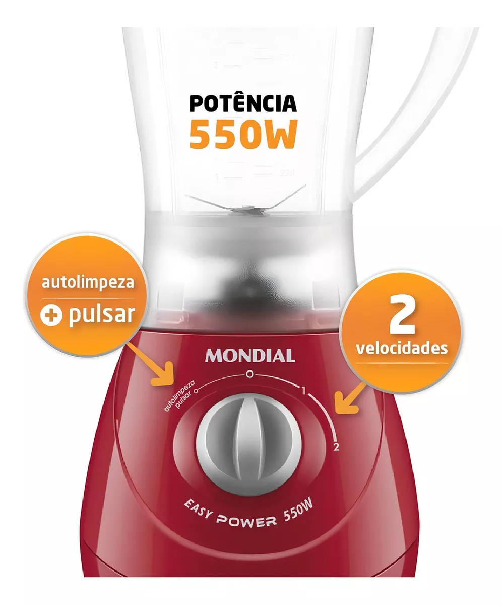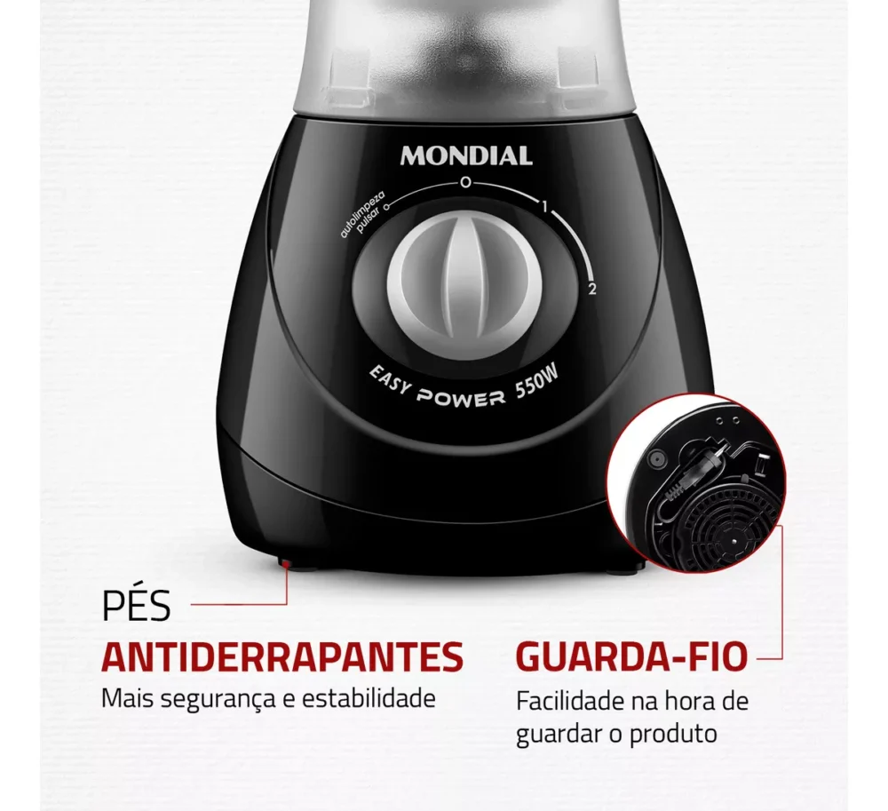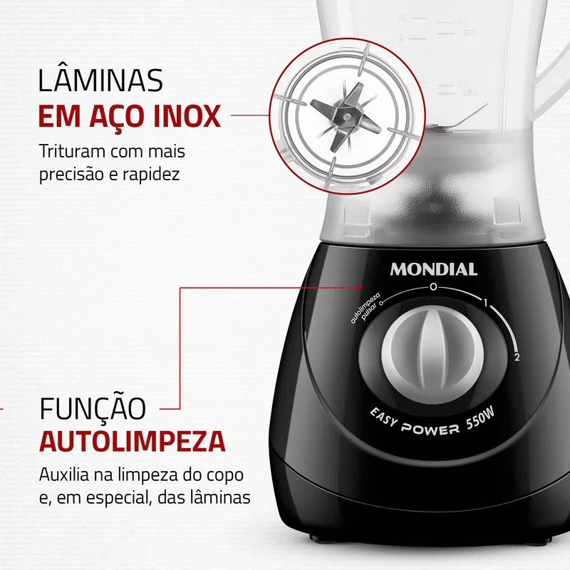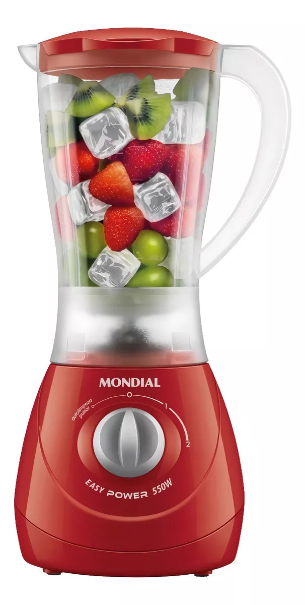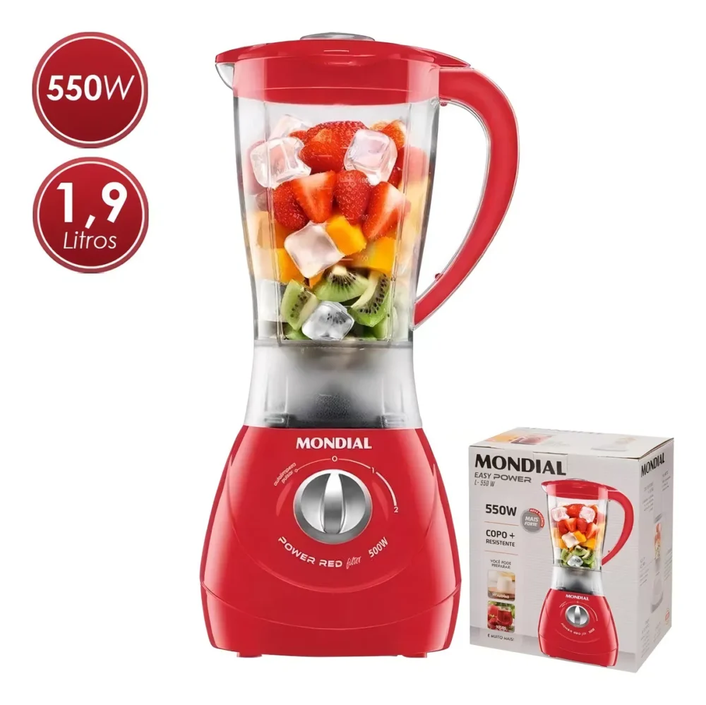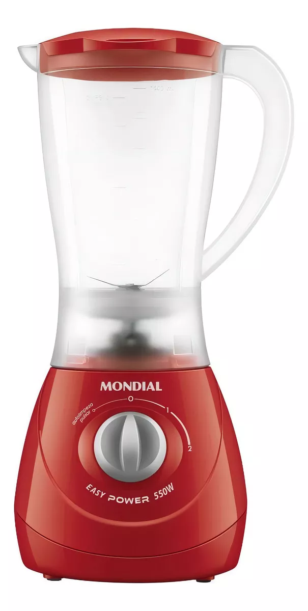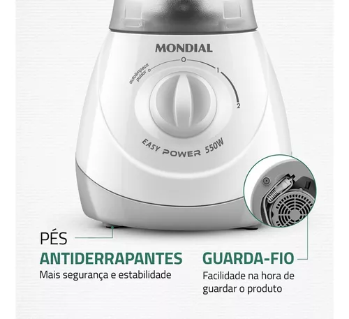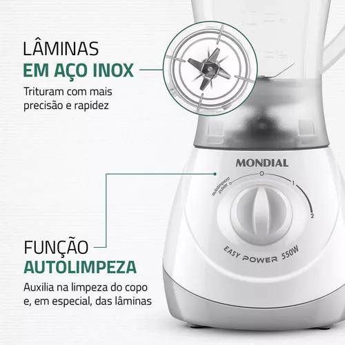 O liquidificador Mondial Easy Power 550W é um aliado na rotina na cozinha. São 550W de potência, capacidade total de 1,9 litros, além de 2 velocidades + Função Pulsar, que tritura até ingredientes mais duros.